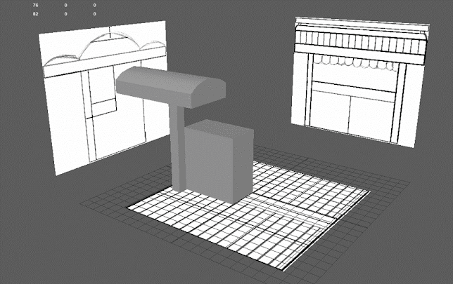 The next model I made was the front stall. Most of this model is really seen in the image so a lot of it didn't need to be made. The process was very simple to make and only required the use of cubes.